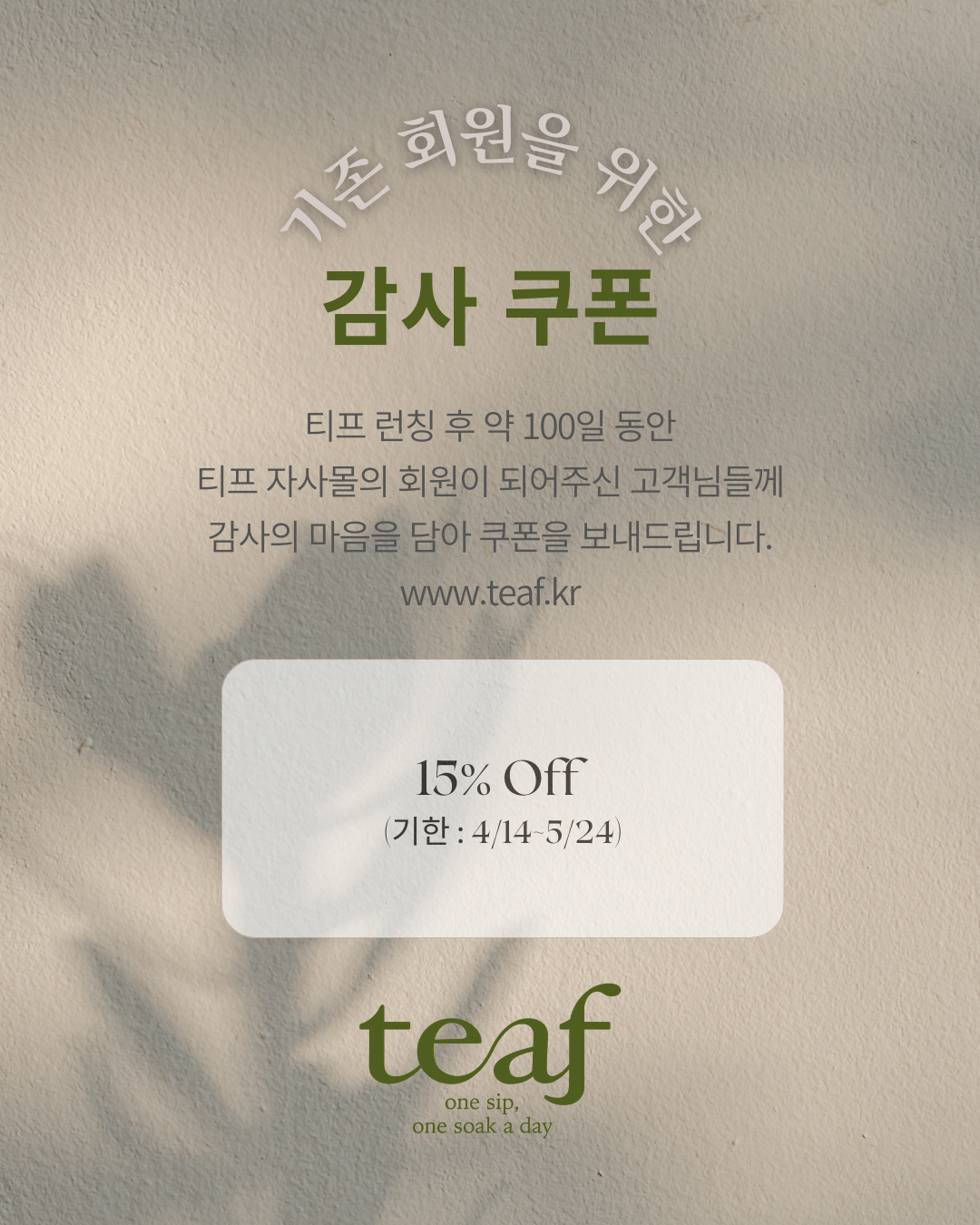4/14~ 5/24 까지 사용가능한 15% 디스카운트 쿠폰을 감사의 마음을 담아 전합니다.
